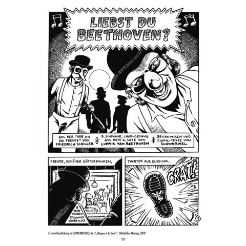 Wie schon in seinem ersten 616-seitigen Ziegelstein-Wälzer von Schwarwel „Schweinevogel TOTAL-O-RAMA – Die Flegeljahre – Alle Comics von 1987 bis 2007“ (erschienen beim Holzhof Vlg, Hrsg. Glücklicher Montag 2010) packt Schweinevogel auch in dieses Buch einfach alles, was in den Jahren von 2008 bis 2012 von und mit ihm erschienen ist: