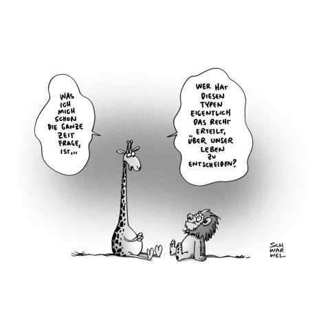 Tiefgreifend, scharfsinnig und pointiert filtert Schwarwel das Besondere heraus, lässt die Wirklichkeit sichtbar werden und bedient sich dabei feiner Ironie und beißendem Spot, der nichts im Halbdunkeln lässt und so Zusammenhänge herstellt, die eine hintergründige Pointe ergeben.