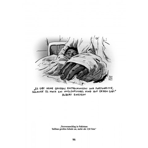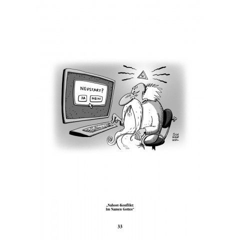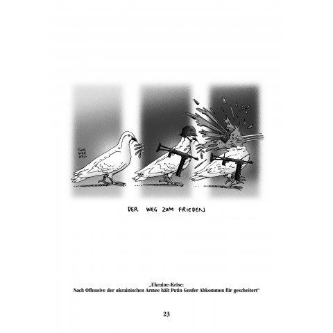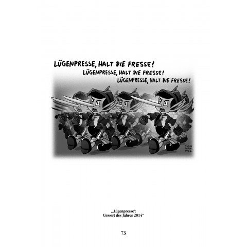 Merkel, Obama, Putin, Ukraine-Krise, KRIM, PEGIDA, Islamisierung, Flüchtlinge, Charlie Hebdo, Lügenpresse, Syriza, Erdogan, TTIP, Waffenlieferung, KITA-Betreuungsproblem, Ice-Challenge, Überwachung, Krieg, Folter, Frieden, Freiheit, Demokratie und Neustart … satirisch, kritisch, entlarvend auf den Punkt und mit einem Augenzwinkern stellt Schwarwel mit spitzer Feder die Geschehnisse aus Politik, Wirtschaft, Gesellschaft und dem Alltäglichen dar.