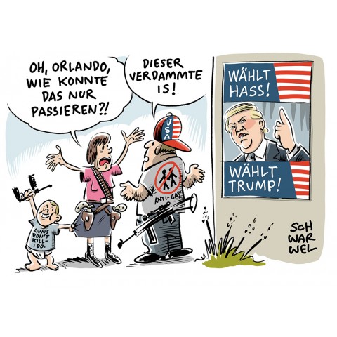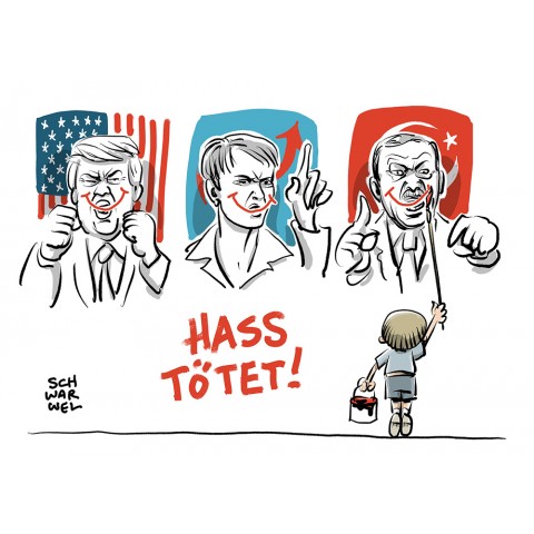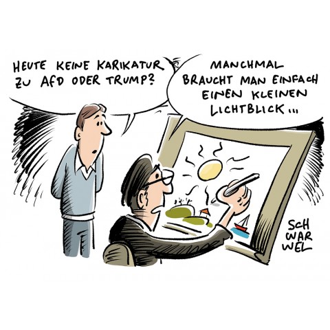Entblößend, konsequent kritisch, humorvoll satirisch, ohne zu zögern und immer auf den Punkt stellt Schwarwel mit spitzer Feder die verschiedenen Themenkomplexe des Alltäglichen, die Geschehnisse aus Politik, Wirtschaft und Gesellschaft dar. Das tut ziemlich oft weh – und genau das kann und muss eine gute Karikatur ja auch.